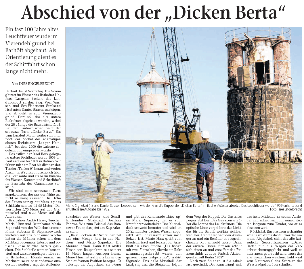 In September 2005 the beacon, also called "Dicke Berta", was removed from its place. There is a report of the "Ostsee-Zeitung".